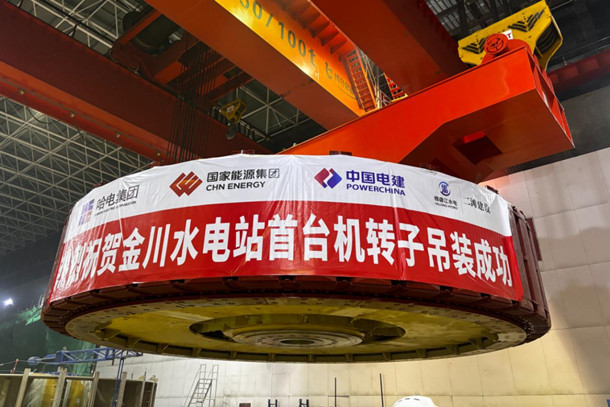图为金川水电站4号机组转子吊装现场