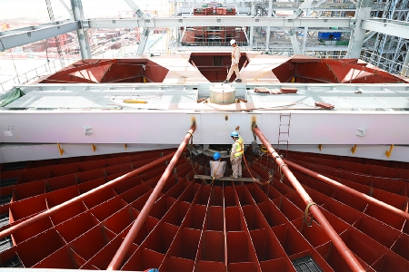 图为工作人员正在对空气预热器换热元件进行安装工作